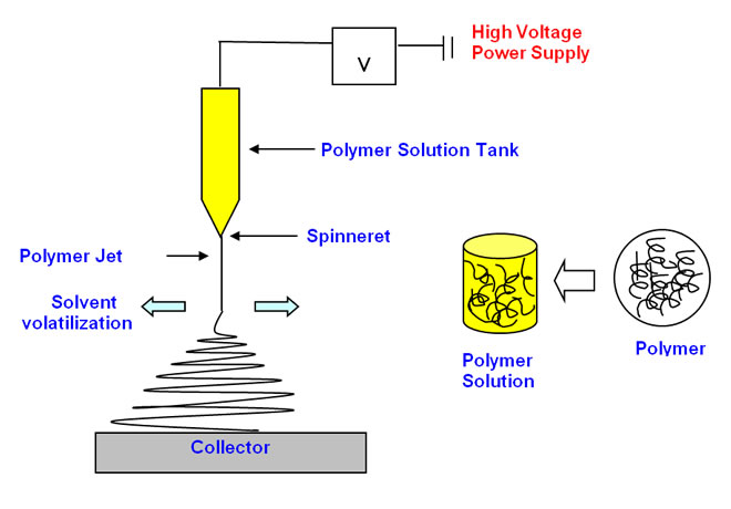 It consists of High Voltage Power supply, Polymer solution tank, Spinneret and grounded Collector. Solution is pushed out at constant speed from Polymer solution tank to Spinneret. It applies 10-30kV to spinneret. When electric attraction exceeds the surface tension of polymer solution, Polymer jet is sprayed toward collector. At this time, solvent of Polymer jet is gradually volatilized. On the collector, the size of jet becomes reduced in nano level.