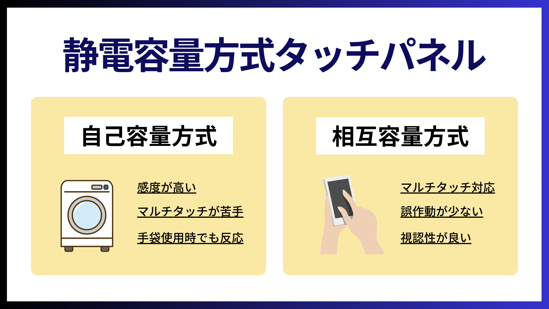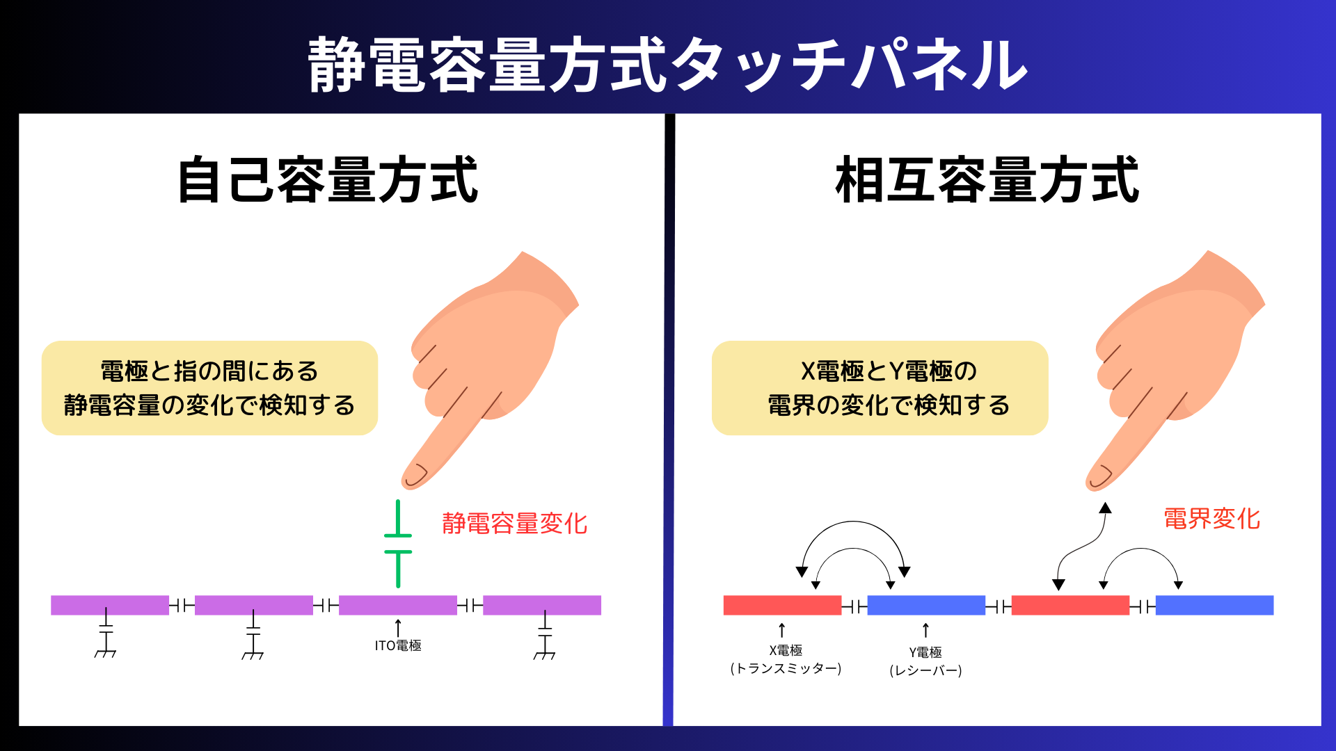 さらに静電容量方式のタッチパネルには「自己容量方式」と「相互容量方式」の2種類が存在します。