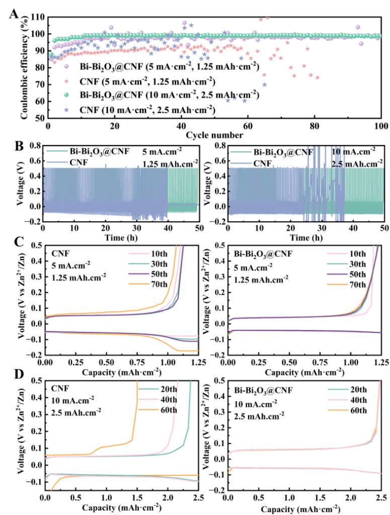 比較実験では、Bi-Bi₂O₃@CNFと通常のCNF(カーボンナノファイバー)の性能が、5 mA·cm⁻² および 10 mA·cm⁻² の電流密度下で評価されました。結果として、Bi-Bi₂O₃@CNFの方が容量保持率と充放電効率において顕著な優位性を示しました。