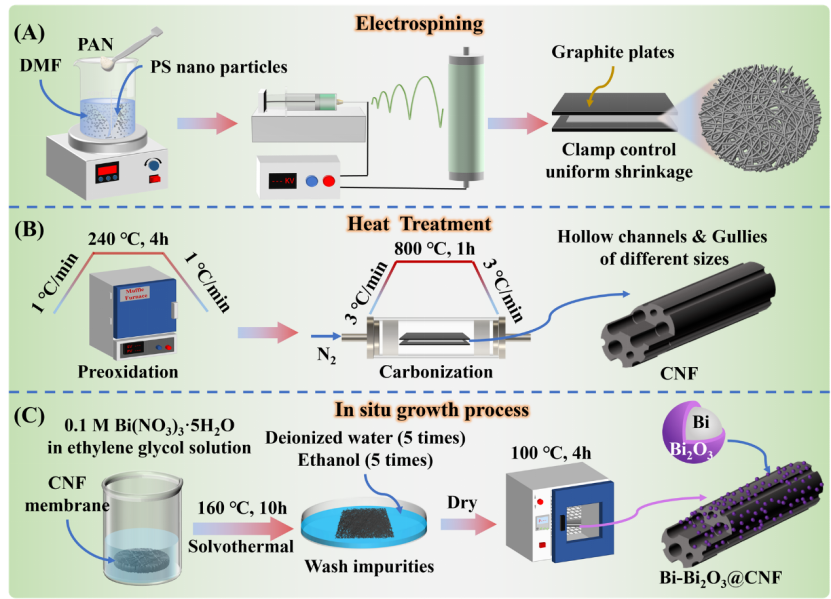北京化工大学の劉勇教授、吉林大学の王策教授、そして清華大学の胡平教授の研究チームは、科学誌 Advanced Functional Materials において、「Spatial and Electrostatic Dual-Confinement in Hierarchical Hollow Bi-Bi₂O₃@Carbon Nanofibers for Dendrite Suppression and Side Reaction Mitigation in Aqueous Zinc-Ion Batteries」という論文を発表しました。この研究では、静電紡糸法(Electrospinning) によって作製された新しいAZIBs用の陽極材料を報告しています。この材料は、Bi-Bi₂O₃を担持したカーボンナノファイバー(Bi-Bi₂O₃@CNF) の複合材料で、階層的な中空構造と表面の溝構造を備え、以下の性能を実現しました。