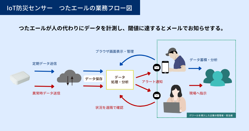当社のつたエールシリーズはIoTセンサーを用いてデータを取得し、アラート機能を用いて業務を効率化するシステムです。