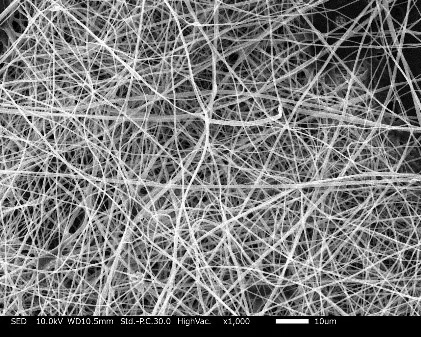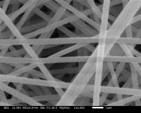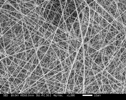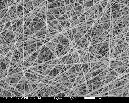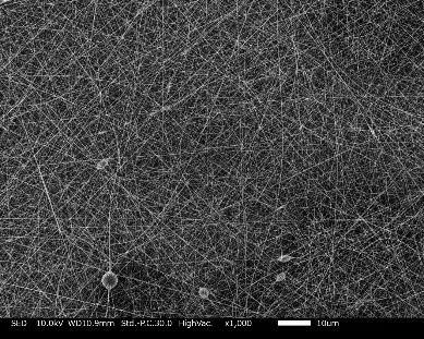 他の溶液で紡糸したものに比べて繊維径が太く仕上がりました!電圧が高いと繊維が細くなったのですが、繊維が均一でなくなりました。電圧が低いと繊維径が太く、均一になりました。