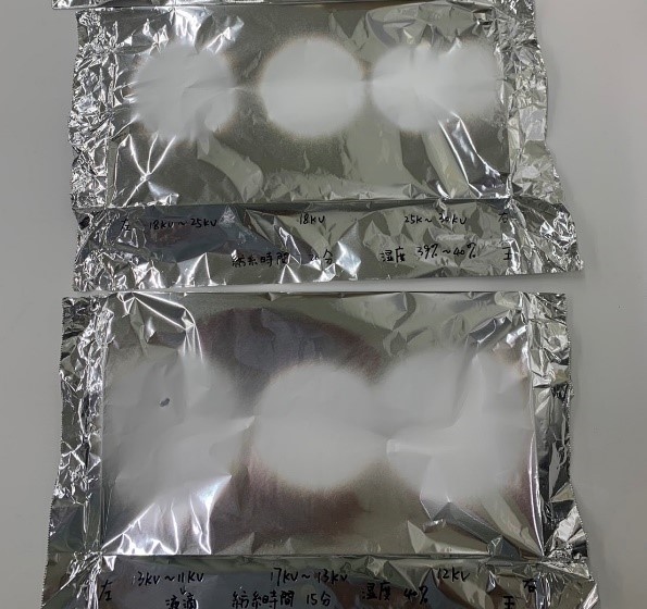 18kV~25kVの範囲で紡糸したファイバーと25kV~30kVの範囲で紡糸したファイバーでは光沢感が違って見える気がする。繊維が変化したのかも!